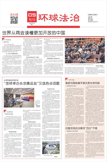 海外媒体还在报道《全国人民代表大会常务委员会工作报告》时称,中共中央政治局委员、全国人大常委会副委员长、中国法学会会长王晨去年底就曾强调,要积极参与涉外法治斗争,更好运用法治方式应对挑战、防范风险、反制打压,坚决维护国家主权、安全和发展利益,维护中国法律的尊严不容侵犯。