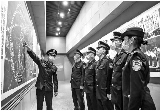 为缅怀和纪念革命先烈,继承发扬革命烈士优良传统,3月30日,乌鲁木齐铁路公安局哈密公安处哈密站派出所民警前往哈密烈士陵园开展“缅怀革命先烈·熔铸忠诚警魂”追思祭扫活动。图为民警参观革命历史展馆,学习革命先烈事迹。