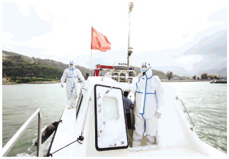 连日来,受海南省三亚市疫情影响,海南省公安厅海岸警察总队第四支队积极响应号召,奋战“疫”线,在各个街道、岸线、港口、景区,全力配合当地党委、政府和社区开展疫情防控工作。图为民警在海上进行巡逻防控。