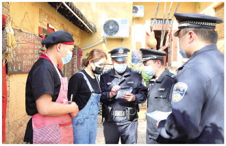近日,河南省洛阳市汝阳县公安局柏树派出所组织民警到辖区旅游景区开展反诈宣传,提高游客反诈意识。图为民警向景区农家乐经营商宣传防诈知识。 本报通讯员 康红军 摄