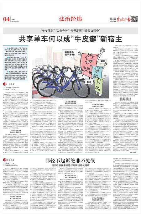 他还提到,非法小广告治理一方面要靠现场取证,另一方面市民监督的力量也不可忽视。但共享单车与墙面、线杆相比,最大的区别在于流动性。执法部门现场取证或市民举报过程中,一些共享单车已经被骑走,或者已经被管理人员移到了其他区域。即便加强属地管理,有时也难免有漏网之鱼。