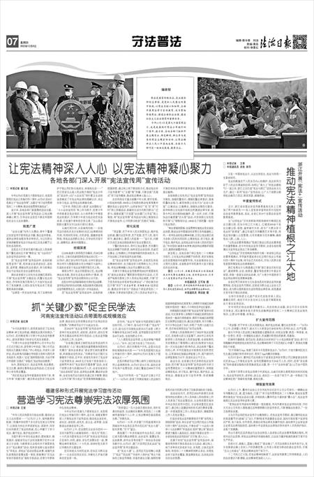 打造全省宪法宣传教育馆并开展“全民线上网络探馆”活动,举办全省“纪念现行宪法公布施行四十周年”法治论坛,开展全省“十大法治人物和十大法治事件”评选活动,组织“蒲公英”普法志愿者力量深入基层社区、家庭开展普法宣传……全省各地宪法宣传活动广泛开展,深入人心。