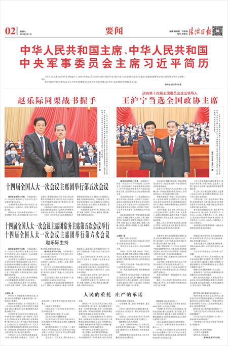 三月十日,全国政协十四届一次会议在北京人民大会堂举行第三次全体会议。当会议主持人宣布王沪宁当选政协第十四届全国委员会主席后,汪洋起立祝贺,与王沪宁热烈握手。