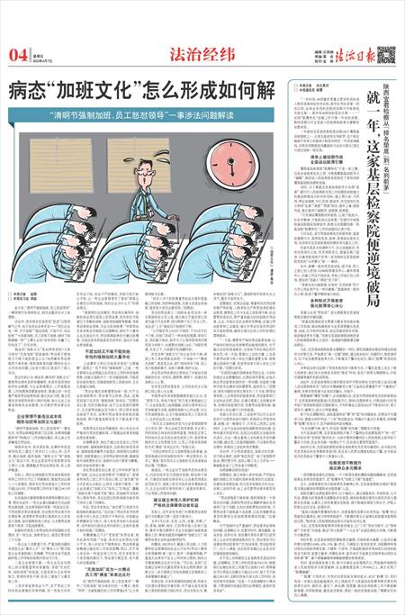 受访专家认为,病态的、畸形的“加班文化”侵害劳动者休息权和健康权,形成有其深刻的经济社会根源,与企业管理观念、工作流程设置、工作氛围等因素紧密相关。要通过进一步完善严格的劳动监察机制,强化执法力度,建立完善投诉举报和举报人保护机制,加大企业工会建设和相关法治教育,合力维护劳动者合法权益。