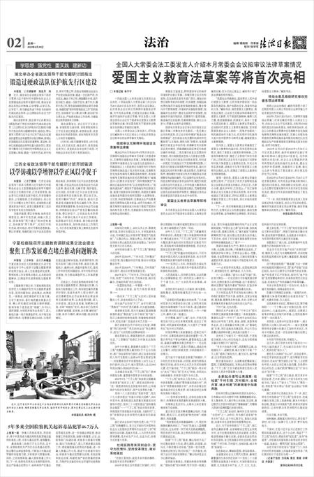 在内容上,爱国主义教育法草案规定了爱国主义教育的内涵目标、指导思想和总体要求,规定了爱国主义教育的领导体制、工作原则和教育内容,规定了主管部门和有关部门的工作职责以及各有关方面面向不同群体和对象开展爱国主义教育的任务,对充分利用各类资源、设施及平台等开展爱国主义教育作出规定。此外,还规定了爱国主义教育的支持保障措施。
