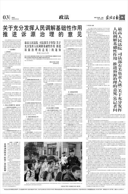 人民调解基础性作用 推进诉源治理的意见》答记者问