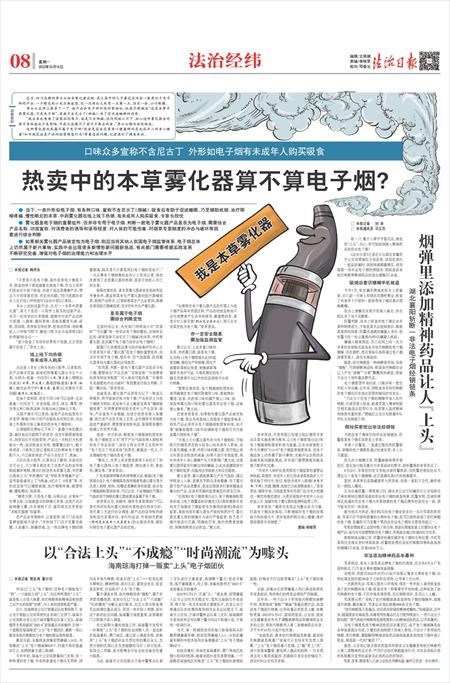 近段时间以来,有关部门持续加大对“奶茶杯”“可乐罐”等一些非法电子烟的整治。而悄然走红的、商家宣称不含尼古丁(烟碱)的本草、中药等雾化器,是否属于电子烟乃至非法电子烟呢?