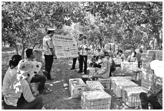 近日,新疆维吾尔自治区轮台县公安局交警大队组织民警走进辖区群巴克镇梨园,开展“美丽乡村行”主题交通安全宣传活动。民警通过和村民一起采摘香梨、聊家常的方式,讲解超员超速、客货混装、拖拉机违法载人、驾乘机动车不系安全带、骑乘摩托车不佩戴安全头盔等交通违法行为的危害性,引导村民提高安全意识,安全驾驶,文明出行。