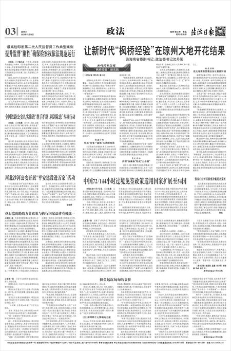 “新时代‘枫桥经验’,从政法战线的一面旗帜,已升华为新时代基层社会治理的典范,成为建设更高水平‘平安海南’‘法治海南’的重大法宝。”近日,海南省委副书记、政法委书记沈丹阳接受《法治日报》记者专访时表示。近年来,海南坚持和发展新时代“枫桥经验”,立足自贸港建设新需求和人民群众新期待,培育打造出一批富有海南特色的新时代“枫桥经验”实践案例和示范典型,探索形成党委领导、政府负责、社会协同、公众参与、法治保障的社会治理“自贸港新路径”。