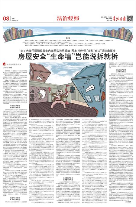 近日接受《法治日报》记者采访的专家认为,相关法律法规早已明确禁止私自拆改承重墙,严重者甚至可能面临刑罚。但由于少数居民法律素养不足、一些装修公司设计观不正、私人领域问题发现查处难等原因,私自拆改承重墙的情况仍时有发生。社区、物业公司、街道、住建部门等相关主体应承担起安全监管责任,对装修过程中出现的问题及时发现整改;居民发现问题也要及时举报。