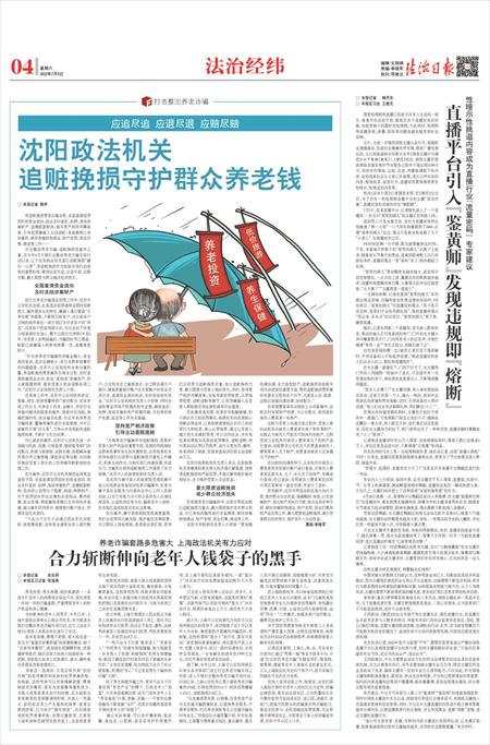 打击整治养老诈骗,追赃挽损是重中之重。自今年4月开展打击整治养老诈骗专项行动以来,辽宁沈阳政法机关紧盯追赃挽损“最后一公里”,将追赃挽损作为检验专项行动成效的重要标准,做到应追尽追、应退尽退,应赔尽赔,最大限度为群众挽回经济损失。