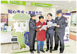 为守护大家的“钱袋子”,近日,山东省烟台市公安局莱山分局经侦大队在辖区银行网点开展防范非法集资和金融诈骗知识宣传。图为民警为办理业务的群众讲解诈骗案例。 本报通讯员 臧保东 王静 摄