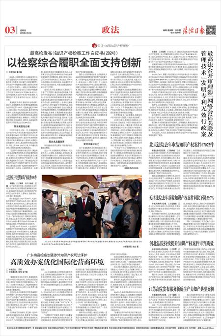 本报北京4月23日讯 记者徐伟伦 记者从北京市高级人民法院今天召开的新闻发布会上获悉,2024年北京法院系统审结各类知识产权案件67075件,其中涉关键核心技术、重点领域、新兴产业的专利案件3514件,专利一审案件审判效率位居世界前列,服务首都加快发展新质生产力。与此同时,北京法院用足用好惩罚性赔偿制度,去年适用该制度的案件量同比增长76.9%,判赔数额最高达7056万元,显著提高了侵权代价和违法成本。