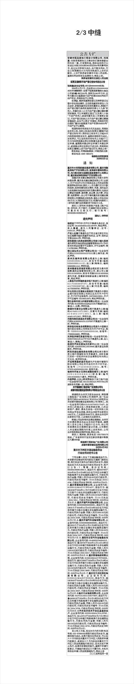 下列当事人发生了交通运输违法行为,未按要求在规定时间内前往交通部门接受处理,现已依法对其作出行政处罚决定书。因其他法定方式无法送达行政处罚决定书,现予以公告:1、韦非,身份证号码:50038419900516661X,违法行为:渝BS279B于2024年09月19日06时33分在万州区长岭镇万利路高洞子处存在超限运输行为,行政处罚执行金额:罚款人民币500.00元的行政处罚,行政处罚决定书编号:万101交执法〔2024〕4740,行政处罚决定书时间:2025年03月26日;2、重庆君鼎物流有限公司,企业信用代码:91500101MA5YUWD43T,违法行为:渝DK9239于2024年11月27日08时37分在万州区万石路千口岩处存在超限运输行为,行政处罚执行金额:罚款人民币1000.00元的行政处罚,行政处罚决定书编号:万101交执法〔2024〕5811,行政处罚决定书时间:2025年04月21日;3、重庆齐谐汽车运输有限公司,企业信用代码:91500000683939606G,违法行为:渝DR0171于2024年10月16日21时33分在万州区李河镇万分路石宝塘处存在超限运输行为,行政处罚执行金额:罚款人民币2000.00元的行政处罚,行政处罚决定书编号:万101交执法〔2024〕5295,行政处罚决定书时间:2025年03月17日;4、重庆齐谐汽车运输有限公司,企业信用代码:91500000683939606G,违法行为:渝DR0171于2024年10月21日08时08分在万州区李河镇万分路石宝塘处存在超限运输行为,行政处罚执行金额:罚款人民币500.00元的行政处罚,行政处罚决定书编号:万101交执法〔2024〕5377,行政处罚决定书时间:2025年03月17日;5、濮阳市交安汽车运输服务有限公司,企业信用代码:9140902079405421E,违法行为:豫J99728于2024年12月13日10时32分在万州区长岭镇万利路高洞子处存在超限运输行为,行政处罚执行金额:罚款人民币1000.00元的行政处罚,行政处罚决定书编号:万101交执法〔2024〕5917,行政处罚决定书时间:2025年03月25日;6、重庆联福物流有限公司,企业信用代码:91500106MA5YWPM939,违法行为:渝DG2865于2024年10月06日19时41分在万州区李河镇万分路石宝塘处存在超限运输行为,行政处罚执行金额:罚款人民币500.00元的行政处罚,行政处罚决定书编号:万101交执法〔2024〕4992,行政处罚决定书时间:2025年04月15日;7、重庆市万州区辰旺物流有限公司,企业信用代码:91500101MA60TNDK56,违法行为:渝DK5563于2024年12月15日07时52分在万州区李河镇万分路石宝塘处存在超限运输行为,行政处罚执行金额:罚款人民币1000.00元的行政处罚,行政处罚决定书编号:万101交执法〔2024〕5927,行政处罚决定书时间:2025年04月15日;8.临沂元合物流有限公司,企业信用代码:91371311MACD9DT69N,违法行为:鲁Q930GB于2024年11月15日10时53分在万州区长岭镇万利路高洞子存在超限运输行为,行政处罚执行金额:罚款人民币1500.00元的行政处罚,行政处罚决定书编号:万101交执法〔2024〕5708,行政处罚决定书时间:2025年03月25日;9.汽车经济技术开发区星通货运户,企业信用代码:92220100MACKAJ679E,违法行为:吉AZS710于2024年09月17日17时13分在万州区长岭镇万利路高洞子存在超限运输行为,行政处罚执行金额:罚款人民币500.00元的行政处罚,行政处罚决定书编号:万101交执法〔2024〕4723,行政处罚决定书时间:2025年03月10日;