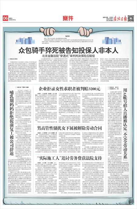 “传统的保险合同涉及三方当事人,即投保人、被保险人和保险公司。而在新就业形态模式下,因用工存在多次分包,交易链条进一步拉长,交易主体增多,保险产品的交易结构日趋复杂,加大了对商业嵌套模式下真实保险合同关系的甄别难度。”北京金融法院立案庭副庭长厉莉在接受《法治日报》记者采访时表示,法院在此案中充分运用“穿透式”审判思维,剖析保险交易架构中的多层商业嵌套,穿透认定众包骑手意外险的实际投保人为骑手,妥善保障了新业态劳动者的保险权益,维护了金融交易的实质公平。