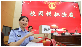 湖北省荆门市沙洋县公安局近日在辖区学校开展以“防范青少年药物滥用”为主题的“模拟法庭”进校园活动,让青少年直观认识药物滥用危害。图为活动现场。