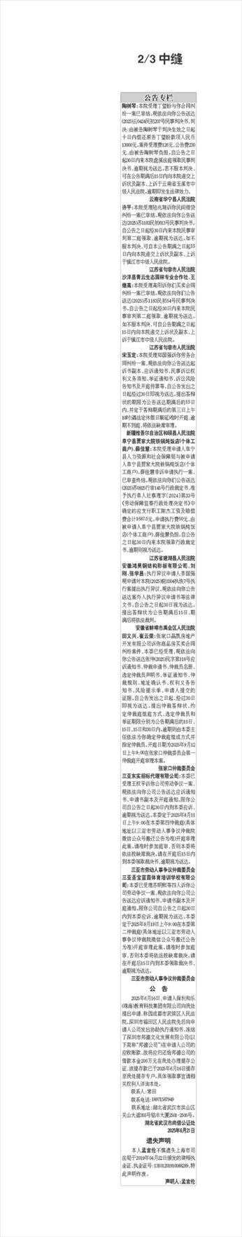 2/3中缝 陶树琴:本院受理丁望盼与你合同纠纷一案已审结。现依法向你公告送达(2025)云0424民初207号民事判决书,判决:由被告陶树琴于判决生效之日起十日内偿还原告丁望盼款项人民币13000元。案件受理费126元,公告费230元,由被告陶树琴负担。自公告之日起30日内来本院盘溪法庭领取民事判决书,逾期视为送达。若不服本判决,可在公告期满后15日内向本院递交上诉状及副本,上诉于云南省玉溪市中级人民法院。逾期即发生法律效力。 云南省华宁县人民法院 许平:本院受理陆兆翔诉你民间借贷纠纷一案已审结。现依法向你公告送达(2025)苏1183民初613号民事判决书。自公告之日起经30日内来本院民事审判第二庭领取,逾期视为送达。如不服本判决,可自本公告期满之日起15日内向本院递交上诉状及副本,上诉于镇江市中级人民法院。 江苏省句容市人民法院 沙洋县青云生态园林专业合作社、王继高:本院受理高阳诉你们买卖合同纠纷一案已审结。现依法向你们公告送达(2025)苏1183民初54号民事判决书。自公告之日起经30日内来本院民事审判第二庭领取,逾期视为送达。如不服本判决,可自公告期满之日起15日内向本院递交上诉状及副本,上诉于镇江市中级人民法院。 江苏省句容市人民法院 宋玉定:本院受理郑国强诉你劳务合同纠纷一案,现依法向你公告送达起诉书副本、应诉通知书、民事诉讼权利义务须知、举证通知书、诉讼风险告知书及开庭传票等。自公告发出之日起经过30日即视为送达。提出答辩状的期限为公告送达期满后的15日内,并定于答辩期满后的第三日上午10时(遇法定休假日顺延)准时开庭,逾期不到庭,将依法缺席审理。 新疆维吾尔自治区和硕县人民法院 阜宁县贾家大院铁锅炖饭店(个体工商户)、薛佳慧:本院受理申请人阜宁县人力资源和社会保障局与被申请人阜宁县贾家大院铁锅炖饭店(个体工商户)、薛佳慧非诉申请执行一案,已审查终结。现依法向你们公告送达(2025)苏0925行审145号行政裁定书,准予执行阜人社察理字〔2024〕第33号《劳动保障监察行政处理决定书》中确定的应支付职工陈杰工资及赔偿费合计1687.5元。申请执行费50元,由被申请人阜宁县贾家大院铁锅炖饭店(个体工商户)、薛佳慧负担。自公告之日起30日内来本院领取行政裁定书,逾期则视为送达。 江苏省建湖县人民法院 安徽鸿昊钢结构彩板有限公司、刘刚、张学昌:执行异议申请人李国强现申请对本院(2025)皖0304执恢7号执行案提出执行异议,现依法向你公告送达案外人执行异议申请书等法律文书。自公告之日起30日视为送达。提出答辩状为公告期满后15日,期满后将依法裁判。 安徽省蚌埠市禹会区人民法院 田义兴、崔云荣:张家口晶凯房地产开发有限公司诉你商品房买卖合同纠纷案件,本委已经受理,现依法向你公告送达张仲(2025)民字第118号应诉通知书、仲裁申请书、仲裁员名册、选定仲裁员声明书、举证通知书、仲裁规则、地址确认书、权利义务告知书、风险提示单、申请人提交的证据。自公告发出之日起,经过30日即视为送达。提出仲裁答辩状、约定仲裁庭组庭方式、选定仲裁员和举证期限分别为公告期满后的15日、15日、15日和30日内。逾期则由本委主任依法为你确定仲裁庭组成方式并指定仲裁员。开庭日期为2025年9月12日上午9:00在张家口仲裁委员会第一仲裁庭开庭审理本案。 张家口仲裁委员会 三亚东实招标代理有限公司:本委已受理王权平诉你公司劳动争议一案,现依法向你公司公告送达应诉通知书、申请书副本及开庭通知。限你公司自公告之日起30日内到本委应诉,逾期视为送达。本委定于2025年8月11日上午9:00在本委第四仲裁庭(具体地址以三亚市劳动人事争议仲裁院微信公众号搬迁公告为准)开庭审理此案。请准时参加庭审,否则本委将依法按缺席裁决。请在开庭后15日内到本委领取裁决书,逾期视为送达。 三亚市劳动人事争议仲裁委员会 三亚圣宝蓝茵体育培训学校有限公司:本委已受理苏明熙等四人诉你公司劳动争议一案,现依法向你公司公告送达应诉通知书、申请书副本及开庭通知。限你公司自公告之日起30日内到本委应诉,逾期视为送达。本委定于2025年8月18日上午9:00在本委第二仲裁庭(具体地址以三亚市劳动人事争议仲裁院微信公众号搬迁公告为准)开庭审理此案。请准时参加庭审,否则本委将依法按缺席裁决。请在开庭后15日内到本委领取裁决书,逾期视为送达。 三亚市劳动人事争议仲裁委员会 公 告 2025年6月16日,申请人保利和乐(珠海)教育科技集团有限公司向我处提出申请,称因成都市武侯区人民法院、深圳市福田区人民法院先后向申请人公司发出协助执行通知书,冻结了深圳市邦德文化发展有限公司(以下简称“邦德公司”)在申请人公司的应收账款,故将应归还给邦德公司的借款本金200万元在我处办理提存公证,该提存款已于2025年6月16日提存至我处提存专户。具体领取事宜请相关权利人详询本处。 联系人:常田 联系电话:18971587949 联系地址:湖北省武汉市洪山区关山大道355号铭丰大厦2501-2505号。 湖北省武汉市尚信公证处 2025年6月21日 遗失声明 本人孟言伦不慎遗失上海市司法局于2019年04月22日颁发的律师执业证,执业证号:13101201910088289,特此声明作废。 声明人:孟言伦