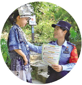图① 德天女警先锋队在德天跨国瀑布景区开展日常巡逻。 袁金锋 摄 图② 德天女警先锋队在景区向前来游玩的小朋友开展安全知识宣传。 范先芳 摄