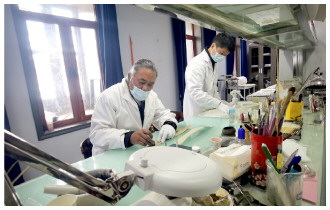 |    布达拉宫贝叶经实验性修复小组实验室工作人员对采集的贝叶进行处理。  |