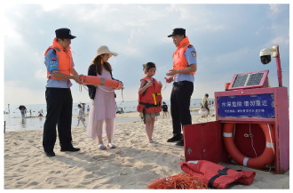 图② 进入暑假以来,江苏省宿迁市公安局湖滨新区分局加强辖区河湖等水域防溺水治安巡逻、涉水景区防溺水安全宣传、救生设备正确使用演示,严防溺水事故发生。图为近日,湖滨新区分局职教园区派出所民警向游客讲解如何使用救生衣等。 本报记者 罗莎莎 本报通讯员 孙明建 摄