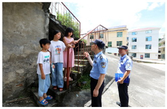 图③ 连日来,江西省分宜县公安局杨桥派出所组织民警深入辖区乡镇,开展“关爱留守儿童 护航平安暑假”普法宣传活动,向孩子们普及交通安全及防诈骗、防拐骗、防溺水等知识。图为7月1日,民警在杨桥镇辋川村向孩子们讲解暑期安全知识。 本报记者 黄辉 本报通讯员 黄小军 摄