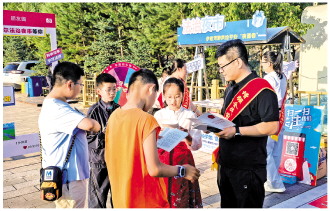 ▲ 7月4日至9月7日,内蒙古自治区呼伦贝尔市委政法委牵头,组织市直政法单位和市信访局、呼伦贝尔边境管理支队等单位共同开展“法治夜市”活动。图为普法宣传员在“法治夜市”宣传国家安全法相关知识。 本报记者 颜爱勇 摄