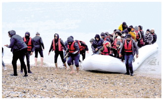 图为一艘偷渡船抵达英国邓杰内斯角海岸。 新华社发