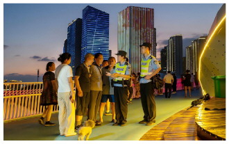 图② 7月3日晚,浙江省台州市公安局黄岩分局城东派出所民警在永宁江景观桥巡逻,并向群众普及夏季安全知识。