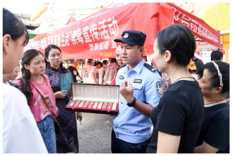 ▲ 近日,江西省宜春市袁州区灵泉街道联合灵泉派出所在当地开展“全民参与禁毒、共享健康生活”禁毒宣传活动,通过展示毒品模型、以案释法、现场答疑等方式,提升人民群众识毒、防毒、拒毒意识。图为民警向群众讲解新型毒品的种类和防范知识。 本报记者 黄辉 本报通讯员 易志钟 摄