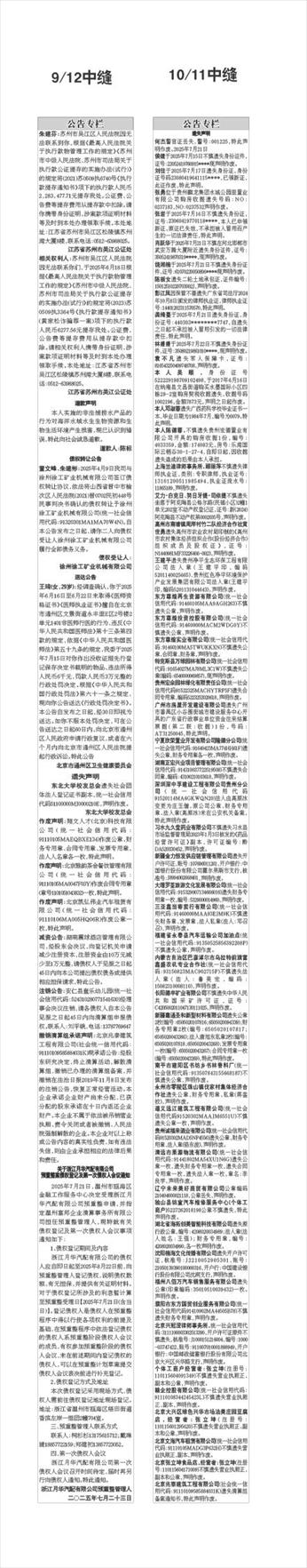 10/11中缝 遗失声明 何杰警官证丢失,警号:001225,特此声明作废。2025年7月21日 侯健于2025年7月15日不慎遗失身份证件,证号:22052419760915****现声明作废。 刘佳于2025年7月17日遗失身份证,身份证号码23080419641115****,已领新证,此证作废,特此声明。 张勇位于贵州麒龙集团水城公园里置业有限公司购房收据遗失号码:NO:0237183,NO:0237532声明作废。 张岩于2025年7月16日不慎遗失身份证,证号:23060419770118****,本人已申领新证,原证已失效,不承担被人冒用而产生的一切法律责任,特此声明。 肖跃华于2025年7月21日不慎在河北邯郸市武安万腾大厦附近遗失身份证件,证号:35052419870319****,现声明作废。 饶湘楠于2025年7月21日不慎遗失身份证件,证号:61070220050806****现声明作废。 陈板女遗失二轮土地承包证,证件编号:15012510220703002J,声明作废。 彭江凤因保管不善遗失广东省司法厅2024年10月8日颁发的律师执业证,律师执业证号:14401202311570570,特此声明。 龚绮蔓于2025年7月21日遗失身份证,身份证号:440303********7747,自遗失之日起不承担被人冒用引发的一切法律责任,特此声明。 林嫚嫚于2025年7月22日不慎遗失身份证件,证号:35080219861010****,现声明作废。 袁不凡遗失军人保障卡,证号:816543250409748708,声明作废。 本人吴顺,身份证号522229198709102498,于2017年6月16日在纳雍县文昌街道购买水墨国际小区四栋29-2室购房契税收据遗失,收据号码1002196,金额7873元,声明之日起作废。 本人邓淑蓉遗失广西药科学校毕业证书一本,毕业日期为1984年7月,编号为0079。特此声明。 本人陈德蓉,不慎遗失贵州宏德置业有限公司开具的购房收据1份,编号:4033359,金额:174083元,房号:乐湾国际云栖谷30-1-27-4,自即日起,因收据遗失造成的后果由本人承担。 上海兰迪律师事务所,顾丽萍不慎遗失律师执业证,类别:专职律师,执业证号:13101200511985494,执业证流水号:11865189,声明作废。 艾力·白克日、努日牙提·司依提不慎遗失坐落于阿克陶县公格尔路(民福小区)2幢1单元202室不动产权登记证,证号:新(2024)阿克陶县不动产权第0002035号,声明作废。 高州市南塘镇周岸村竹二队经济合作社黄世勇遗失高州市农业农村局印制的《高州市农村集体经济组织合作(股份经济合作)组织成员及股权证》,证号:N1440981MF33226406-0023,声明作废。 王建平遗失贵州净平生态环保工程有限公司法人章(王建平印,编码5201140025665)、贵州红色净平环境保护产业发展集团有限公司法人章(王建平印,编码5201131044643),声明作废。 东方尊煌再生资源有限公司(统一社会信用代码:91460105MAA9AGH263)不慎遗失公章,声明作废。 东方尊煌投资控股有限公司(统一社会信用代码:91460000MACM2WDG0Y)不慎遗失公章,声明作废。 东方尊煌实业有限公司(统一社会信用代码:91460100MA5TWUKKXN)不慎遗失公章、合同章、财务章,声明作废。 特克斯县万绿园林有限公司(统一社会信用代码:91654027MA78ML3C1W)不慎遗失公章(编码:6540000069857),现声明作废。 贵州宏余园林绿化有限责任公司(统一社会信用代码91522325MACHYTRP5F)遗失合同专用章,编码5223252020618,声明作废。 广州市房屋开发建设有限公司遗失广州市番禺区小谷围街城市建设服务中心开具的广东省行政事业单位资金往来结算票据(第二联:收据)1份,号码:AT31250045,特此声明。 宁夏欣荣置业开发有限公司隆德分公司(统一社会信用代码:91640423MA774HH61F)遗失公章,财务专用章各一枚,声明作废。 湖南正宏兴业项目管理有限公司(统一社会信用代码:914310037722519508)不慎遗失合同章,编码:43100210103618,声明作废。 深圳深中孚建设工程有限公司贵州分公司(统一社会信用代码91520114MA6GKWQN20)法人由高原冰变更为庄玉僧,原公司公章、财务专用章、法人章(高原冰)未在公安机关备案,特此声明作废。 习水九久堂药业有限公司不慎遗失习水县市场监督管理局2023年1月3日核发的《药品经营许可证》副本,许可证编号:黔DA520330452,声明作废。 新疆金力恒发供应链管理有限公司遗失开户许可证,账号:107696011261,开户银行:中国银行股份有限公司霍尔果斯市支行,核准号:J8994002668401,声明作废。 大理罗荃旅游文化发展有限公司(统一社会信用代码:915329007134666016)遗失财务专用章一枚,编号:5329000014960,声明作废。 三亚鑫当寄卖行有限公司(统一社会信用代码:91460000MAA93EJM9K)不慎遗失财务章、发票章、法人私章(法人:邓召召),声明作废。 福建省永春县汽车运输公司加油点(统一社会信用代码:91350525856392208P)不慎遗失公章,声明作废。 内蒙古自治区巴彦淖尔市乌拉特前旗富鑫盛农机专业合作社(统一社会信用代码:93150823MAC902715P)不慎遗失法人章(法人:鲁美宏,编码:15082310008110),声明作废。 长阳德丰矿业有限公司不慎遗失中华人民共和国采矿许可证,证号:C4205002011047130111025,声明作废。 新疆嘉通圣和新型材料有限公司遗失公章2枚(编号:6505020107816;6505020094339);财务专用章2枚(编号:6505020107817;6505020043266);法人唐旭东私章2枚(编号:6505020107818;6505020043268);发票专用章一枚(编号:6505020043267);合同专用章一枚(编号:6505020043269),特此声明作废。 南平市建阳区书坊乡书林香料厂(统一社会信用代码:913507843155668187)不慎遗失公章,声明作废。 永州市零陵区珠山镇伐家村集体经济合作社遗失公章、财务专用章、私章(蒋銮姣),声明作废。 遵义远江建筑工程有限公司(统一社会信用代码91520302MAAJM6551U)不慎遗失公章一枚,声明