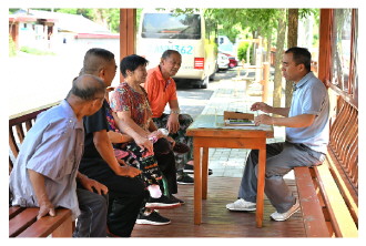 图② 7月1日,在北京市怀柔区长哨营满族乡三道窝铺村法治文化长廊,村居法律顾问、北京振铎律师事务所律师围绕土地承包合同签订等法律问题为村民普法。