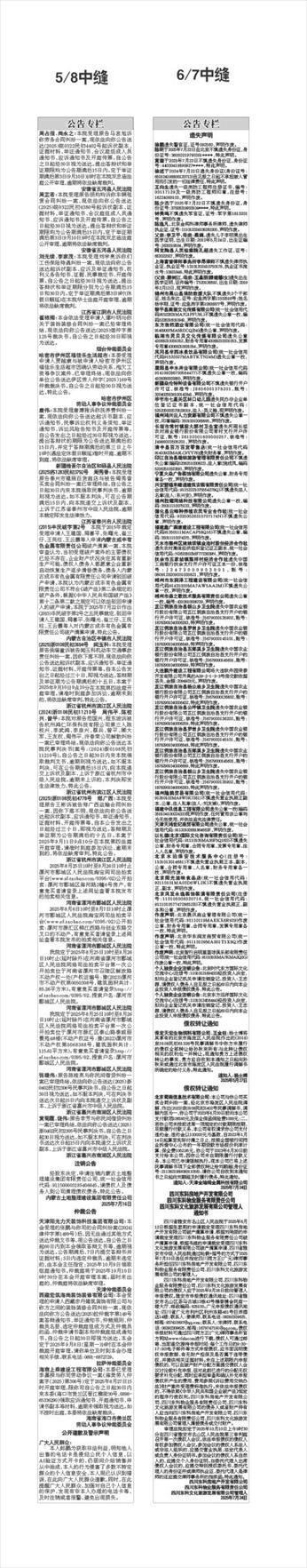 5/8中缝 周占报、尚永之:本院受理原告马言旭诉你劳务合同纠纷一案,现依法向你公告送达(2025)皖0322民初4402号起诉状副本、证据材料、举证通知书、合议庭组成人员通知书、应诉通知书及开庭传票。自公告之日起经30日视为送达。提出答辩状和举证期限均为公告期满后15日内。定于举证期满后第3日(9月10日)10时在本院双忠庙法庭公开审理,逾期将依法缺席裁判。 安徽省五河县人民法院 周芷若:本院受理原告胡均均诉你车辆租赁合同纠纷一案,现依法向你公告送达(2025)皖0322民初4380号起诉状副本、证据材料、举证通知书、合议庭组成人员通知书、应诉通知书及开庭传票。自公告之日起经30日视为送达。提出答辩状和举证期限均为公告期满后15日内。定于举证期满后第3日(9月10日)9时在本院双忠庙法庭公开审理,逾期将依法缺席裁判。 安徽省五河县人民法院 刘光续、李家茂:本院受理刘学亮诉你们工伤保险待遇纠纷一案,现依法向你公告送达起诉状副本、应诉及举证通知书、权利义务告知书、证据、民事裁定书、开庭传票。自公告之日起经30日视为送达。提出答辩状和举证期限分别为公告期满后15日和30日内。定于举证期满后第3日9时(休假日顺延)在本院华士法庭开庭审理,逾期将依法缺席裁判。 江苏省江阴市人民法院 崔栋翔:本会依法受理申请人谭叶明与你关于装饰装修合同纠纷一案已经审理终结,现依法向你公告送达(2025)烟仲字第125号裁决书。自公告之日起经30日即视为送达。 烟台仲裁委员会 哈密市伊州区福佳乐生活超市:本委受理申请人贾越康与被申请人哈密市伊州区福佳乐生活超市因确认劳动关系、拖欠工资等争议案件,已审理终结。现依法向你单位公告送达伊区劳人仲字〔2025〕169号仲裁裁决书。自公告之日起经30日视为送达。特此公告。 哈密市伊州区 劳动人事争议仲裁委员会 唐伟:本院受理唐博雅诉你抚养费纠纷一案,现依法向你公告送达起诉书副本、应诉通知书,民事诉讼权利义务须知、举证通知书、诉讼风险告知书及开庭传票等。自公告发出之日起经过30日即视为送达。提出答辩状的期限为公告送达期满后的15日内,并定于答辩期满后的第三日上午10时(遇法定休假日顺延)准时开庭,逾期不到庭,将依法缺席审理。 新疆维吾尔自治区和硕县人民法院 (2025)苏1283民初3792号 周秀香:本院受理原告泰兴市建照百货商店与被告周秀香买卖合同纠纷一案已审理终结。自公告之日起30日内来本院领取民事判决书,逾期则视为送达。如不服本判决,可在公告期满后15日内,向本院递交上诉状及副本,上诉于江苏省泰州市中级人民法院。逾期本裁定即发生法律效力。 江苏省泰兴市人民法院 (2015)丰民破字第2号 本院于2015年裁定受理申请人王建国、周喜平、张曙光、崔三仔、王艮柱、王云霞等人申请内蒙古成丰有色金属有限责任公司破产清算一案,本院审查认为,当初受理破产案件的主要债权已经不存在,企业财产状况决定其有重新生产可能。债权人债务人都愿意企业重新启动恢复生产逐步清偿债务。债务人内蒙古成丰有色金属有限责任公司申请驳回破产申请。本院认为内蒙古成丰有色金属有限责任公司不符合《破产法》第二条规定的破产条件,根据《中华人民共和国破产法》第十二条第二款之规定可以依法驳回申请人的破产申请。本院于2025年7月22日作出(2015)丰民破字第2号之五民事裁定,驳回申请人王建国、周喜平、张曙光、崔三仔、王艮柱、王云霞等人对内蒙古成丰有色金属有限责任公司破产清算申请。特此公告。 内蒙古自治区丰镇市人民法院 (2025)浙0108民初3694号 闻玉科:本院受理原告侯瑞童诉被告闻玉科机动车交通事故责任纠纷一案,因你下落不明,现依法向你公告送达起诉状副本、应诉通知书、举证通知书、证据材料、开庭传票等。自本公告发出之日起经过三十日,即视为送达。答辩期及举证期为公告期满后的十五日。本案于2025年9月10日9点10分在本院第四法庭开庭审理。请准时到庭参加诉讼,逾期未到的,将依法缺席审判。特此公告。 浙江省杭州市滨江区人民法院 (2024)浙0108民初11210号 周伟平、陈校兴、曾平:本院对原告范国兴、程东坡诉被告杭州鸿仁环保科技有限公司第三人陈校兴、李武鸿、李彦兴、蔡兵、曾平、顾大军、王友权、周伟平、许春荣公司解散纠纷一案已审理终结。现依法向你公告送达本院民事判决书[案号:(2024)浙0108民初11210号]。自公告之日起30日内来本院领取裁判文书,逾期则视为送达。如不服本判决,可在公告期满后15日内,向本院递交上诉状及副本,上诉于浙江省杭州市中级人民法院。逾期未上诉的,本判决即发生法律效力。特此公告。 浙江省杭州市滨江区人民法院 (2025)浙0108民初4778号 郑广西:本院受理原告王彬诉被告郑广西运输合同纠纷一案,因你下落不明,现依法向你公告送达起诉状副本、应诉通知书、举证通知书、证据材料、开庭传票等。自本公告发出之日起经过三十日,即视为送达。答辩期及举证期为公告期满后的十五日。本案于2025年9月11日9点10分在本院第四法庭开庭审理。请准时到庭参加诉讼,逾期未到的,将依法缺席审判。特此公告。 浙江省杭州市滨江区人民法院 2025年8月25日10时至8月26日10时止漯河市郾城区人民法院淘宝网司法拍卖平台(www.sf.taobao.com/0395/02)公开拍卖:漯河市郾城区海河