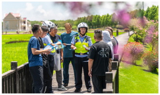 7月26日,上海市公安局崇明分局横沙派出所民警在稻田画景区开展动态巡逻,并向游客宣传反诈知识。图为民警向游客讲解常见的诈骗形式。