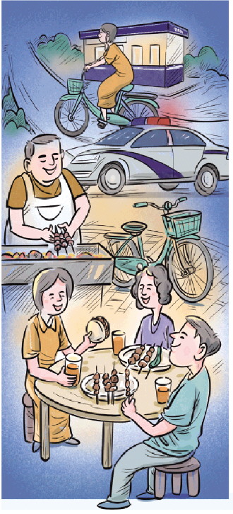 7月14日晚上11点,刚下夜班的李红戴上耳机,播放手机里收藏的歌曲,启动电动自行车,驶向4公里外的家。 这段位于河南省鹤壁市淇滨区的夜归路,既有灯火通明的夜市,也有相对僻静的路段。 “独自走夜路,不是我胆子大,是在鹤壁生活真的感觉很安全,走到哪儿心里都踏实。”李红对同行的《法治日报》记者如是说。 不一会儿,路过一个四季红火的烧烤夜市。李红熟练地停好车,向摊主喊道:“烤5串羊肉串,再烤个烧饼,夹到饼里。”“好嘞!”摊主边用搭在脖子上的毛巾擦汗边应声。 “我在网上看到有些地方夜市会发生纠纷甚至起冲突,但在我印象里,我们这儿的烧烤摊从来没出过这种事。坐在这儿,享受的就是这份安稳的人间烟火气。”李红感慨道。 这时,摊主将金黄酥脆、夹满肉串的烧饼递到李红手中。她咬了一口:“还是老味道!” 正吃着,一辆警灯闪烁的警车缓缓驶过,停在不远处。记者看到,民警下车后仔细检查了路边的车辆,查看是否有车主疏忽未锁车门。 “夏天开车来夜市的人多,常有‘马大哈’忘锁车门。昨天我看小区微信群里的警情通报,才知道最近发生了几起拉车门盗窃案。”李红告诉记者。 她翻出手机信息:7月13日凌晨1时许,4名犯罪嫌疑人组成盗窃团伙,从外地流窜到鹤壁市区后,骑乘共享单车在马路两侧徘徊。正在巡逻的民辅警发现后上前盘查,当场从他们携带的背包中查获了破窗器、汽车遥控解码器等作案工具。 于是有民警在微信群里提醒说:汽车不是保险箱,不要将手机、现金、首饰等贵重物品放在车里。夜间停车后,要立即锁好车门,离开车子时,要用手拉一下,看是不是锁上了……如果发现车内财物被盗,要第一时间报警。 “多亏民警提醒,我才知道有不法分子用汽车遥控解码器干扰车主锁车,等车主离开后,他们就打开车门进行盗窃。现在我和我老公都养成了锁车后拉一把车门确认的习惯。”李红说。 “一年四季,晚上总能看见警灯,心里特踏实。”一旁的烧烤摊主笑着插话,“以前摆摊怕有人喝多闹事,现在警车巡逻到凌晨,民警还常来提醒‘打架成本高’,我这生意越做越红火,干劲儿也更足了。” “是啊,下夜班路上常看到警灯,我也觉得特别安心。”李红点头附和。 享用完夜宵,李红再次启程。明亮的路灯下,不时有骑行的人从身边驶过,还有三三两两的行人嬉笑着在路边行走。 在离她家不远处,有个街面警务站,这一下又打开了李红的话匣子。 “那警灯旁边设有便民自助服务终端,24小时对群众开放。我试过,开户籍证明不用再赶工作时间,凭身份证按提示操作,2分钟就打印好了,特方便。”李红告诉记者。 “我邻居张某把车停在小区外,车内两条烟被盗。他本来觉得损失不大不想报警,路过警务站时顺口提了一句。没想到下午民警就通知他窃贼抓到了,让他去领烟。这事之后,张某总跟邻居们说‘警务站虽小,守的是咱老百姓的大平安’。”李红回忆说。 据鹤壁市公安局治安防控中心主任王永飞介绍,街面警务站在通过智慧警务服务群众的同时,按照“秒级反应、快速到达、警种联动、协同处置”的原则,充分发挥距离近、反应快的优势,根据街面发案的季节性、地域性、时间性等规律特点,实时进行动态分析,进一步优化“网格布警、屯警街面、动中备勤、巡逻处警”接处警勤务,纳入全市110快速反应体系,实现巡处一体化,确保群众报警和紧急求助得到及时高效受理处置,为群众拧紧“安全阀”。 行至家门口,望着不远处依然亮灯的警务站,李红轻声感叹:“这深夜亮着的灯,还有路上巡逻的警灯,就是咱们老百姓心里最踏实的‘平安灯’。能这样安心地上下班、吃夜宵、过平常日子,就是最大的幸福。” 漫画/高岳