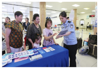 图② 山东省烟台港航公安局近日组织民警来到烟台港客运站,通过趣味答题、模拟游戏等方式,向旅客宣传反诈、防毒等法律知识。图为民警向旅客讲解反诈知识。 本报通讯员 臧保东 黄云龙 摄
