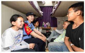 图① 7月25日,青藏铁路公安局西宁乘警支队民警护航暑运,为乘坐Z22次列车的小朋友宣讲乘车安全知识。
