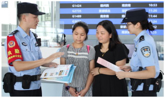 暑运期间,南昌铁路公安局组织警力深入辖区车站及铁路沿线,围绕防盗窃、防诈骗等向出行旅客普及安全知识。图为南昌铁路公安局鹰潭公安处余干站派出所民警近日在候车室向旅客讲解常见反诈案例。 本报记者 黄辉 本报通讯员 张翼翀 陈金淼 摄