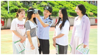 7月30日,贵州省黔西市公安局民警来到辖区太来彝族苗族乡太来村的返乡中小学生身边,通过展示仿真毒品模型、指导体验VR眼镜、发放宣传单,向返乡学生宣讲禁毒知识,提高他们的拒毒防毒意识。图为民警帮助学生佩戴VR眼镜。 本报通讯员 周训超 摄