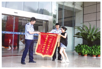 图为今年6月,湖北省十堰市市民刘女士为感谢市公安局现案侦查队为其快速找回被盗手机,专程送来锦旗。 赵伟 摄 |