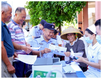 图② 近日,海南省公安厅反走私和海岸管理总队、总队第一支队联合省老年病医院在海口市演丰镇演海村开展“健康惠民义诊+反走私普法宣传”警医共建活动。图为民警向村民发放反走私宣传材料。 本报记者 邢东伟 翟小功 本报通讯员 代龙超 摄