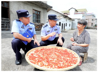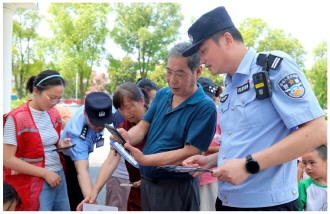 ▲ 连日来,江西省分宜县公安局组织民辅警走村入户开展普法宣传,与群众面对面交流,宣传防火、防骗、防盗等安全防范知识,持续守护辖区平安。图为民警在洋江镇杨潭村入户开展普法宣传。 本报记者 黄辉 本报通讯员 黄小军 摄