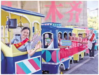 ▲ 近日,新疆维吾尔自治区乌鲁木齐市经开区(头屯河区)委网信办、经开区(头屯河区)司法局高铁司法所等单位在小绿谷公园联合开展“普法小火车进公园”活动。图为司法行政干警及相关工作人员将小火车布置成普法载体,吸引群众关注法律知识。 本报记者 潘从武 本报通讯员 费玲玉 摄