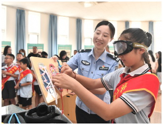 近日,天津市滨海强制隔离戒毒所联合滨海新区大港第二小学开展“无毒青春,护航成长”暑期夏令营研学实践活动,三十余名师生、家长走进戒毒场所,“沉浸式”体验禁毒戒毒普法教育。图为学生通过VR模拟眼镜感受毒品危害。 本报记者 范瑞恒 本报通讯员 王超 摄