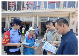 | 8月7日,10余名小学生志愿者在北京铁路公安处北京站派出所、北京市重点站区管委会北京站办共同组织下,成立宣传小分队在北京站广场开展反诈宣传。图为民警和小学生志愿者向旅客发放反诈宣传资料。 本报记者 黄洁 本报通讯员 卢忠凯 赵变珍 摄 |