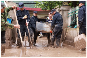 ▲ 图为8月8日,甘肃省兰州市公安局特警支队民警在榆中县城关镇兴隆山村帮助村民清理淤泥、抢救财物。