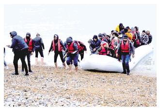 图为一艘偷渡船抵达英国邓杰内斯角海岸。
