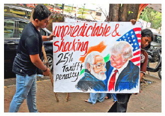 图为当地时间8月1日,印度马哈拉施特拉邦孟买,古鲁库尔艺术学院的学生们在学校外举着印度总理莫迪和美国总统特朗普的海报,反对特朗普对印度加征关税。 CFP供图