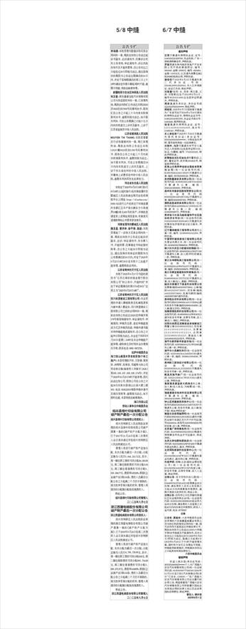 6/7中缝 遗失声明 汪熨不慎遗失律师执业证,证号:14403202210205798,执业机构:广东一律美律师事务所,声明作废。 罗源万遗失株州鸿洋房地产开发有限公司开具的票据两份,编号:4018443,金额:15000元,编号:4018454,金额:110522元,以及遗失湖景名城2栋3009的购房合同,声明作废。 潘俊恺于2025年8月2日不慎遗失第二代身份证,号码:331081200512020016,本人已申领新证,此证已失效。特此声明。 刘紫萱(性别:女,母亲:蒋文莲,父亲:刘智清)出生于2013年8月11日,编号M350314891出生医学证明遗失,声明作废。 周家友遗失身份证,身份证号码42243219761010****,特此声明。 郑晓哲,2025年8月7日因保管不善遗失广东省司法厅2024年4月19日颁发的律师执业证书,律师执业证书号:14401201410053705,执业证书流水号:11933268,现声明作废。 杨宝光遗失律师执业证,证号:12114199410404465,流水号:11685316,声明作废。 本人李苑萌于2025年7月30日不慎遗失居民身份证(身份证号:65010420010930****),今特此挂失声明,冒用者将承担一切法律责任。 白敬科,冯莎不慎遗失毕节市七星关区人民医院《出生医学证明》1份,姓名:白檩峻,编号:V520332325,特此声明作废。 武警临沧支队纪金生遗失警官证(上尉),警官证号:武字第1934821号,特登报声明作废。 武夷山市夷养养老综合服务有限责任公司(统一社会信用代码:91350782MA321UH34Y)不慎遗失公章,编码:35078210001329,声明作废。 泉州凯馨源家具有限公司(统一社会信用代码:91350524MA8RY6AM19)不慎遗失公章,编码:35052410008656,声明作废。 盘州东河苗家医院有限责任公司(统一社会信用代码91520222MABN29CG0Q)不慎遗失公章,编码5202025057252,声明作废。 濮阳县胜诚劳务有限公司(统一社会信用代码91410928MACJ3N5E1K)不慎遗失公章一枚,编码4109280088771,声明作废。 贵州省习水县马临街道和平社区股份经济合作社(统一社会信用代码N2520330MF2620048G)不慎遗失农村集体经济组织登记证正副本,声明作废。 辽宁嘉阔建筑工程有限公司遗失公章一枚,编号:210800001012209,声明作废。 宁夏明轩建筑装饰工程有限公司遗失营业执照正本,统一社会信用代码:91640403317899691M,声明作废。 银川市兴庆区小欧建材经销部(统一社会信用代码:92640103MA766JFU09)不慎遗失公章、法人(欧早阳)印章各一枚,声明作废。 晋江市坤博电梯工程有限公司(统一社会信用代码:91350582MABW97M47P)不慎遗失公章,编码:35058210066679,声明作废。 昌江石碌宜建建筑材料销售店(统一社会信用代码:92460000MAC372TK3E)不慎遗失公章,法人章(法人:黄雄),声明作废。 韶关市信德天下信息科技有限公司发票章(编码4402030073894)、公章(编码4402030073895)、财务章(编码4402030073896)、私章刘源枝(编码4402030073897)遗失作废。 贵州电扶农科技有限公司(统一社会信用代码91520900MA6GU5B85Q)遗失财务专用章(编码5209001004580)、法人章(黄元宇印),声明作废。 海南荣瑞医药科技有限公司(统一社会信用代码:91460000MABW8545XE)遗失财务专用章、发票专用章、法人章(法人:陶红),声明作废。 沈阳市铁西区泥鳅信息咨询策划工作室公章210106001052212、财务章210106001052213、发票章210106001052214、合同章210106001052215、黄迪法人章210106001052216丢失,声明作废。 漳平市新桥新丰家庭农场(统一社会信用代码:92350881MA2Y2W5D86)遗失公章一枚,声明作废。 漳平市小吴摩托车行(统一社会信用代码:92350881MA34MR0C89)遗失公章一枚,编码:35088110004566,声明作废。 贵州欧工装饰设计有限公司(统一社会信用代码91520303MAALXXKM1K)不慎遗失财务专用章一枚,声明作废。 岷县风驰汽修厂(统一社会信用代码:92621126MACWBXY8X1)遗失公章,声明作废。 高新温泉康益家大药房遗失公章;法人章(法人姓名:刘峻霖)各一枚,声明作废。 福建畲源农牧林科技发展有限公司不慎遗失公章,编码:35010410119690,声明作废。 钟山区闳鑫建筑劳务中心(统一社会信用代码92520201MACMBTRJ5P)不慎遗失公章、财务专用章、法人章(张天智),特此声明作废! 南昌市友家网咖网吧(统一社会信用代码91360104MA35G438XX)遗失中国民生银行东湖区支行开户许可证(账号162484544,核准号J4210035926201)和财务章、法人章,声明作废。 北京道广律师事务所(统一社会信用代码:31110000MD021185XE)现遗失律师事务所执业许可证副本,特此声明。 北京太师屯颐和居旅店(统一社会信用代码:92110228MA00P4F42R)不慎遗失营业执照正、副本,声明作废。 北京网际新源科技发展中心(统一社会信用代码:91110108MA04PWJ21C)不慎遗失营业执照正、副本和公章,声明作废。 作废声明:辰峰(北京)国际会展有限公司(统一社会信用代码:91110105MA01HWDU6P)作废公章、财务专用章、合同专用章、法人人名章,特此声明。 注销公告:东方市科沃幼儿园(统一社会信用代码:52469007MJP32144X2)经理事会决议注销,请各债权人自本公告见报之日起45日内向清算组申报债权,逾期不报视为放弃权利,特此公告。 注销公告:沈阳市辽中区茨榆坨街道社区社会组织联合会(统一社会信用代码:51210122MJ2939811B)经会员大会决议注销,请各债权人自登报之日起45日内向本单位申报债权。联系人:金天淇,电话:87755057 公告 江后有、莫奎玲:六安仲裁委员会依法受理的六安海嘉蓝城置业有限公司与你们民间借贷合同纠纷一案,因无法向你方直接送达仲裁法律文书,现依法向你方公告送达(2025)六仲裁字第021号组庭及开庭通知书。自本公告发出之日起经过30日(2025年9月10日)即视为送达,届满之日起第9