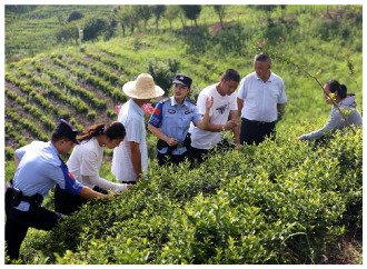 近年来,安徽省舒城县公安局在各景区配备“生态警长”,全力守护辖区生态环境。图为全国生态日前夕,舒城县公安局舒茶派出所民警在舒茶镇石塘村生态茶园开展巡查,并向游客讲解生态环境保护法律知识。