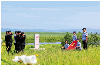 图为内蒙古自治区呼伦贝尔边境管理支队额尔古纳边境管理大队室韦边境派出所民警和护边员在110号界碑旁重温入党誓词。 李永建 摄 |